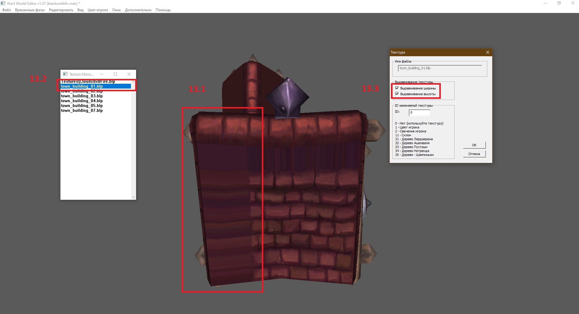 Лечится очень просто. War 3 Model Editor, правой кнопкой мыши по неправильной текстуре (13.2), установить галки на выравнивание (13.3). Спасибо WebSter за совет.