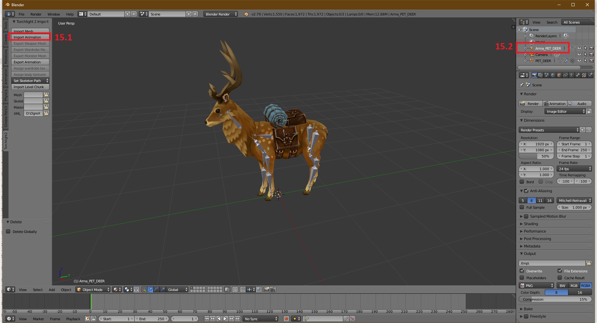 Вместе с мешем мы видим и кости. В панеле импорта Torchlight моделей подсветилась кнопка Import Animation (15.1). Если она не активна, то нужно выделить скелет ПКМ во вьюпорте или ЛКМ в списке объектов сцены (15.2).