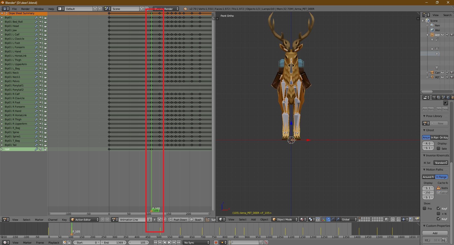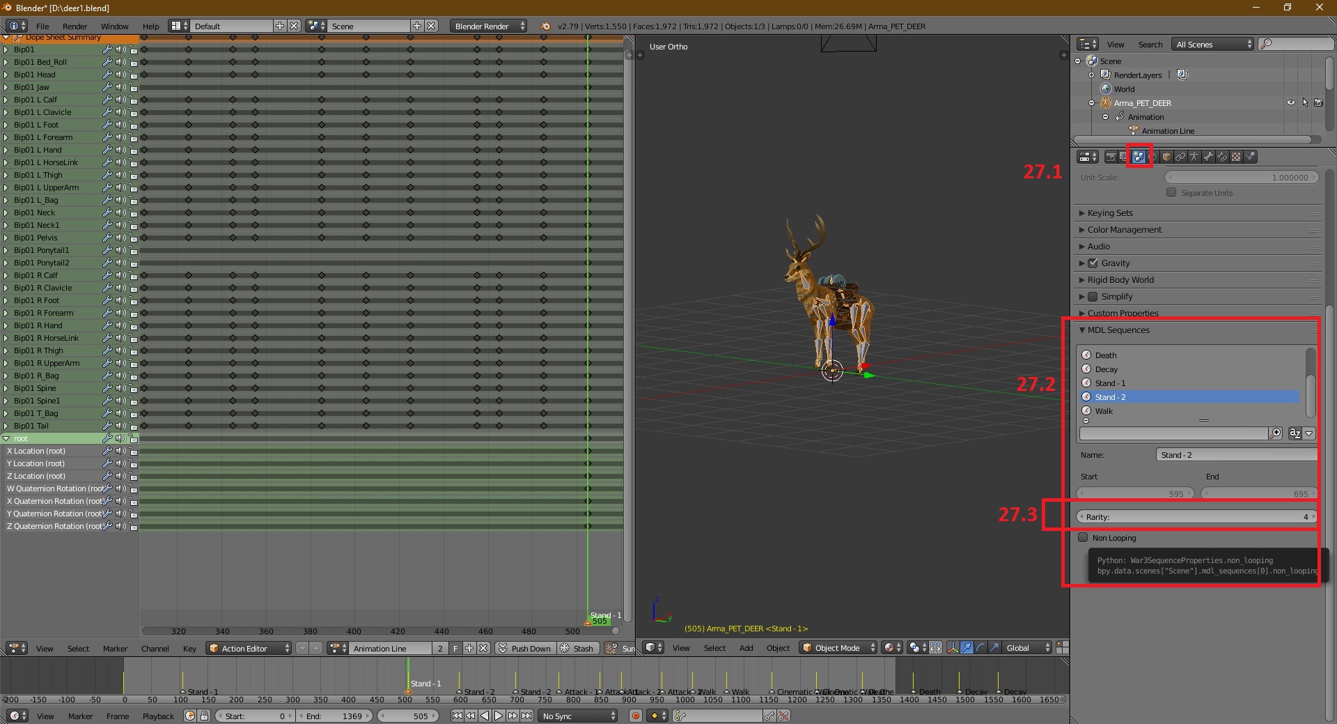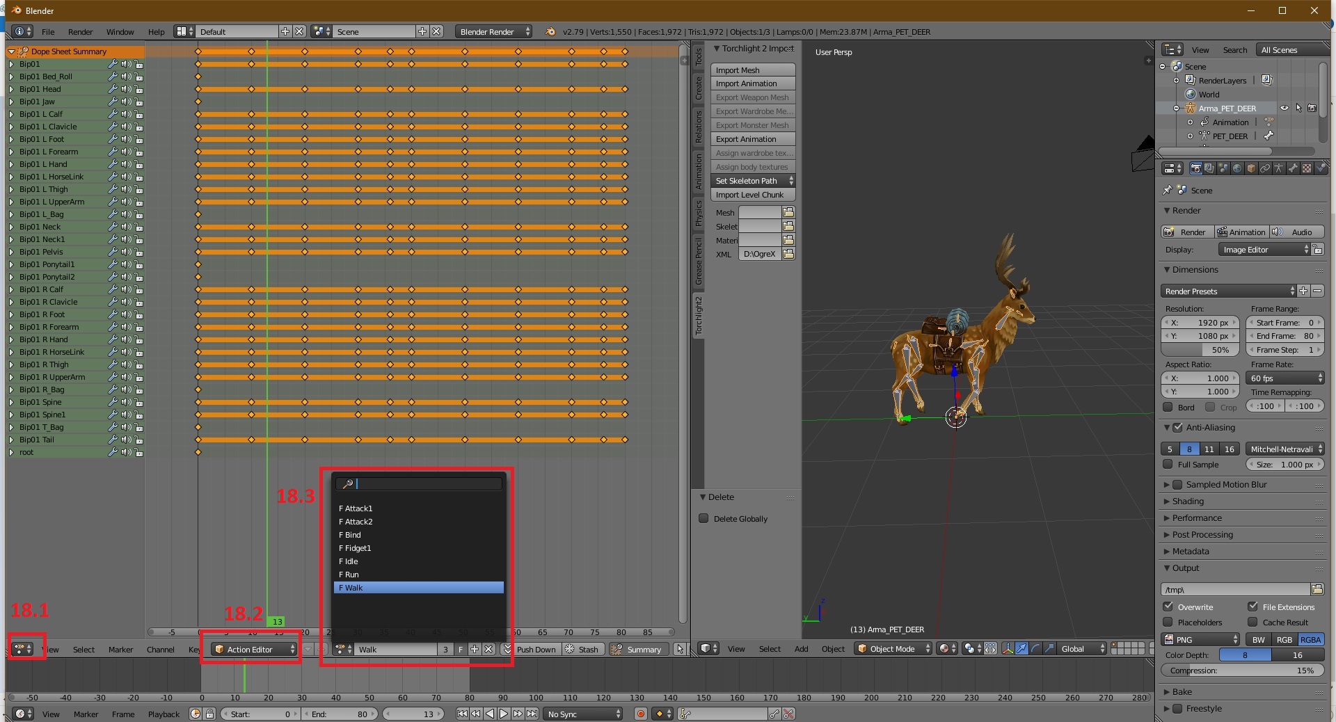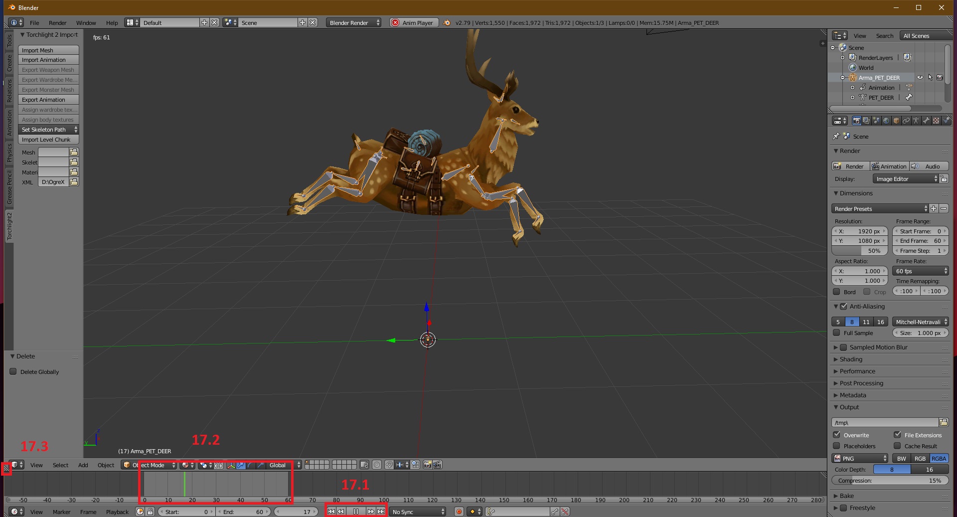 Итак, сразу выбираем PET_DEER.SKELETON. Смотрим на сцену, модель должна стоять ровно. Иногда, она переворачивается. В этом случае, надо выделить модель и скелет, нажать на клавишу R, нажать на клавижу оси (X, Y или Z) и повернуть всю конструкцию правильно. В случае с оленем всё в порядке. Возвращаемся в раздел импорта анимаций и двойным кликом проходимся по всем анимациям. Проигрывать анимацию можно кнопками плеера (17.1), проходить по кадрам можно на таймлайне (17.2)