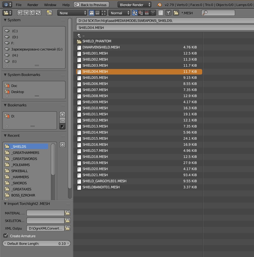Сразу удаляем со сцены куб, источник света и камеру. Выделяем их правой кнопкой мыши и жмём клавишу “X”. После этого переходим на вкладку Torchlight 2 и жмём в окошке Import Mesh (1.3), откроется окно проводника. Предлагаю начать с оружия, так как это реально кладезь. Идём по пути …\MEDIA\MODELS\WEAPONS\, там находим папку _SHIELDS.
