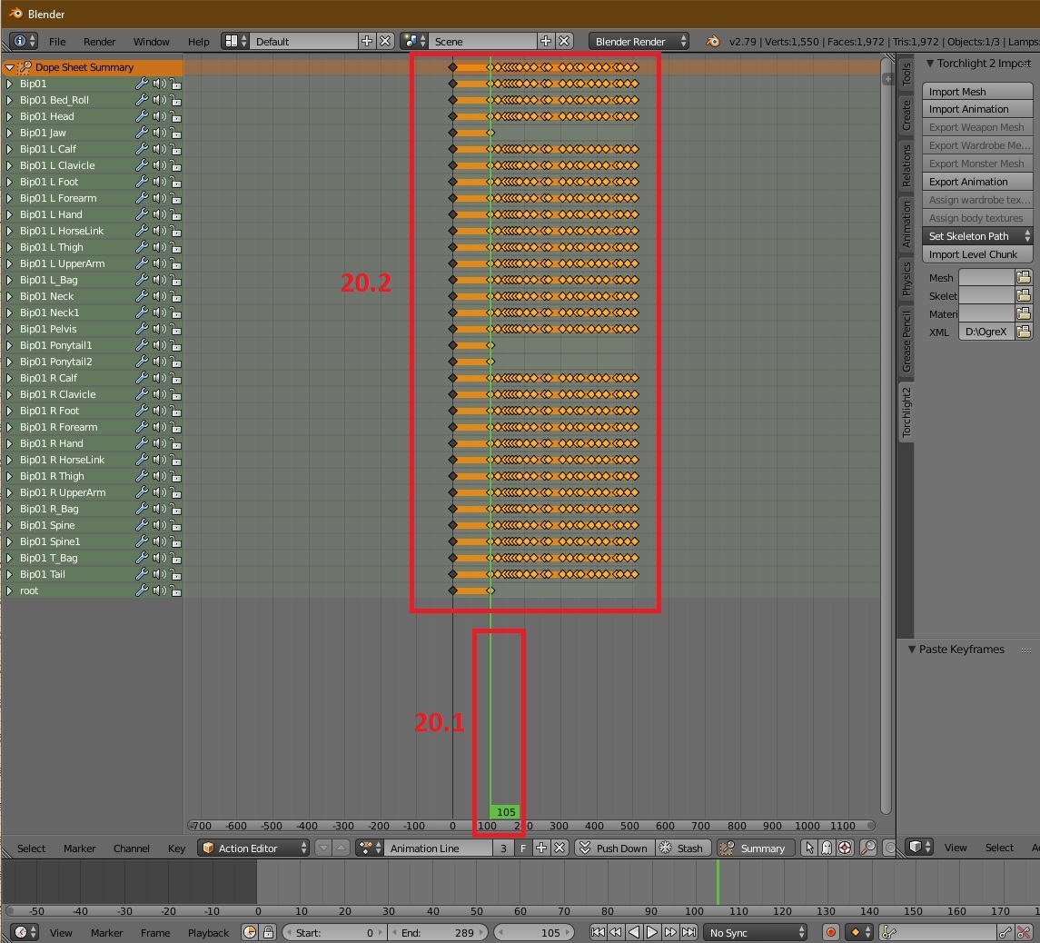 Все выбранные кадры подсвечены жёлто-оранжевым. После того как мы всё выбрали нажимаем Ctrl+C, и переключаемся на наш первоначальный Action. Тот, который bind, который Animation Line. Устанавливаем зелёную линию подальше первого кадра (20.1), и нажимаем Ctrl+V. Новые кадры появились (20.2).
