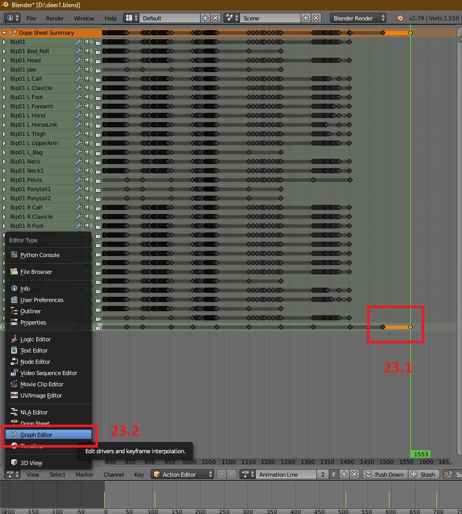 Включаем последний кадр и идём в Graph Editor (23.2).