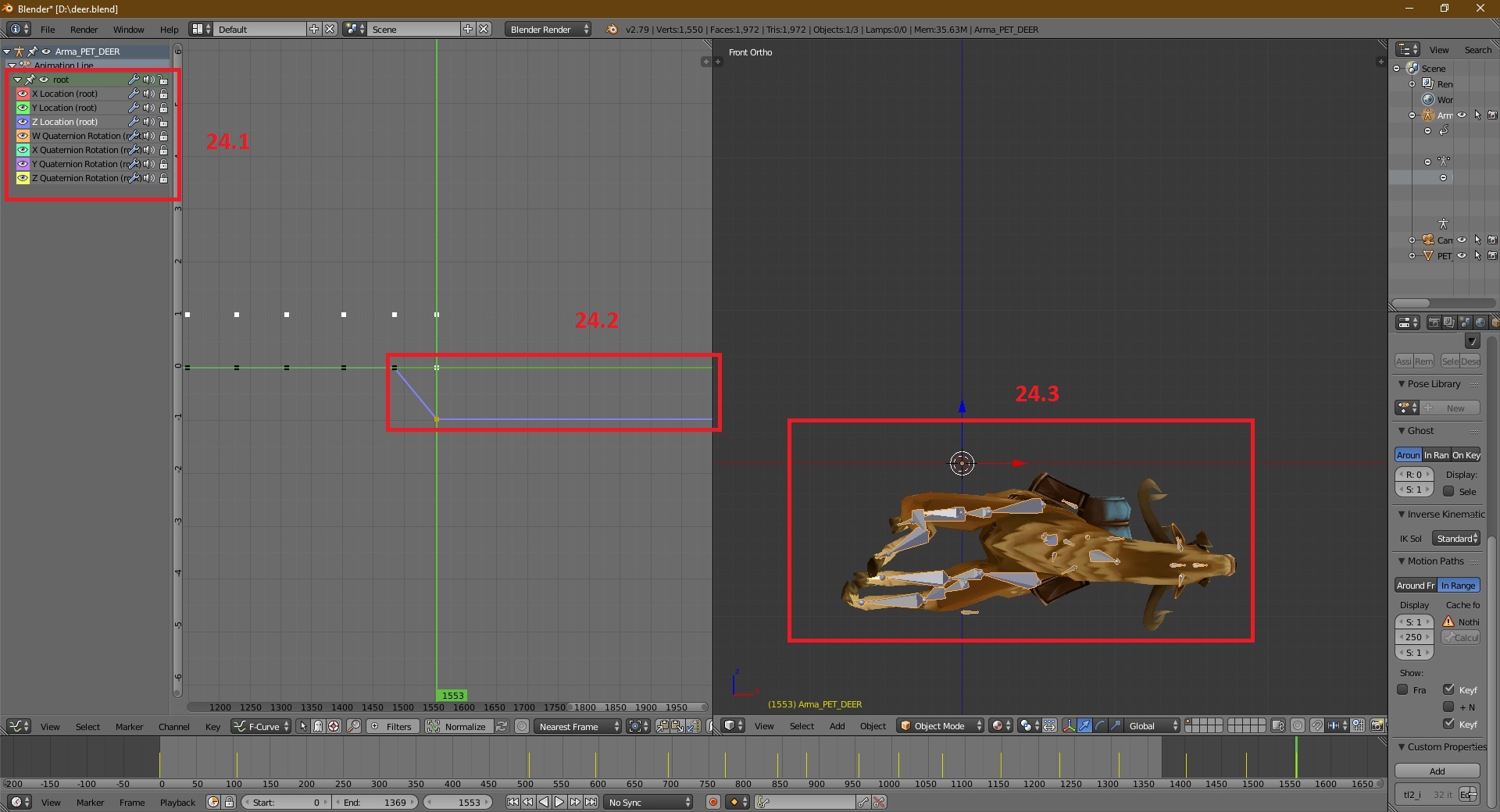 Закрываем все замки (24.1), кроме Z Location, нажимаем на клавишу G, и опускаем кость (24.2) до тех пор, пока наш олень не окажется ниже оси (24.3).