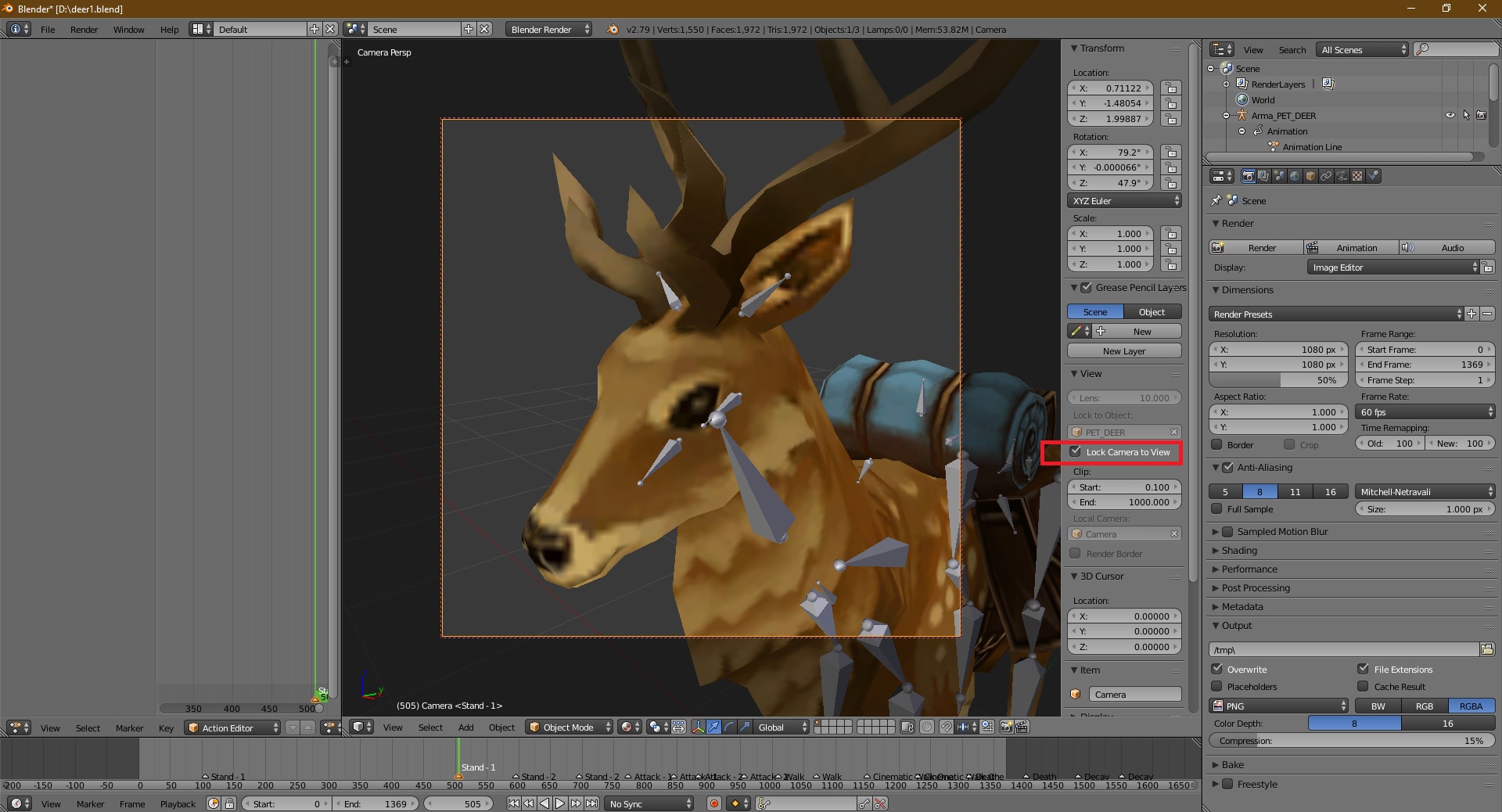 Вспомним про камеру. Во вьюпорте нажимаем на клавишу N, откроется панель свойств. Ставим галочку Lock Camera to View, и нажимаем на Num0, мы перейдём на вид из камеры. Двигая мышью установим камеру на морду оленя.
