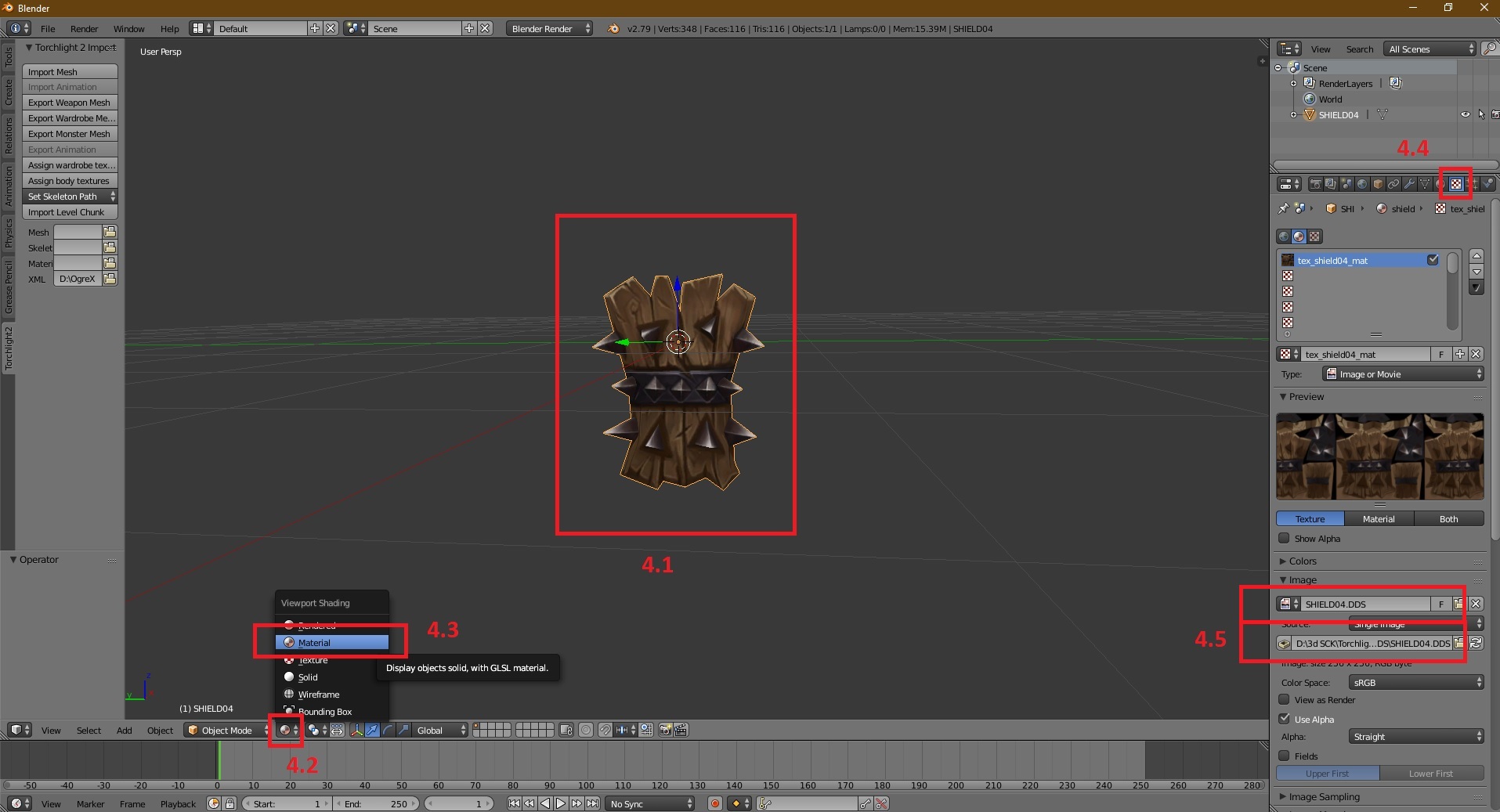 Дабл клик по файлу SHIELD04.MESH, и вот он у нас в сцене (4.1). Давайте посмотрим на него с текстурой. Ищем кнопку внизу с выпадающим списком (4.2), включаем отображение материала (4.3).