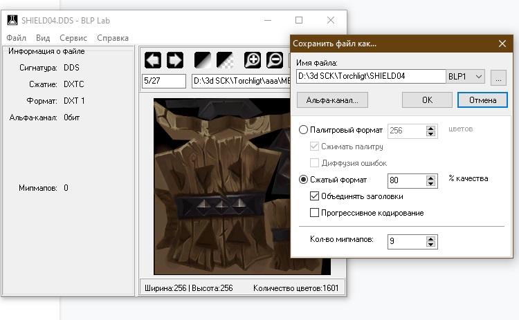 Займёмся текстурой. Для использования в HD графике можно оставить DDS (предварительно оставив этот формат в поле 5.4). Для SD графики нужно конвертировать. Расчехлив BLP Laboratory, идём в ту папку игрового архива, где лежал наш щит. Находим там наш SHIELD04.DDS. Открываем и пересохраняем в BLP, дав файлу указанное в настройке материала имя.