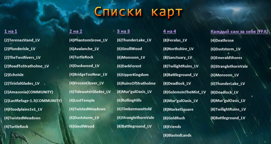 - Пулы карт: Все карты для рейтинговых игр (1x1, 2x2, 3x3, 4x4 и FFA) были обновлены классическими и изменёнными классическими картами. Полный список карт расположен чуть ниже.