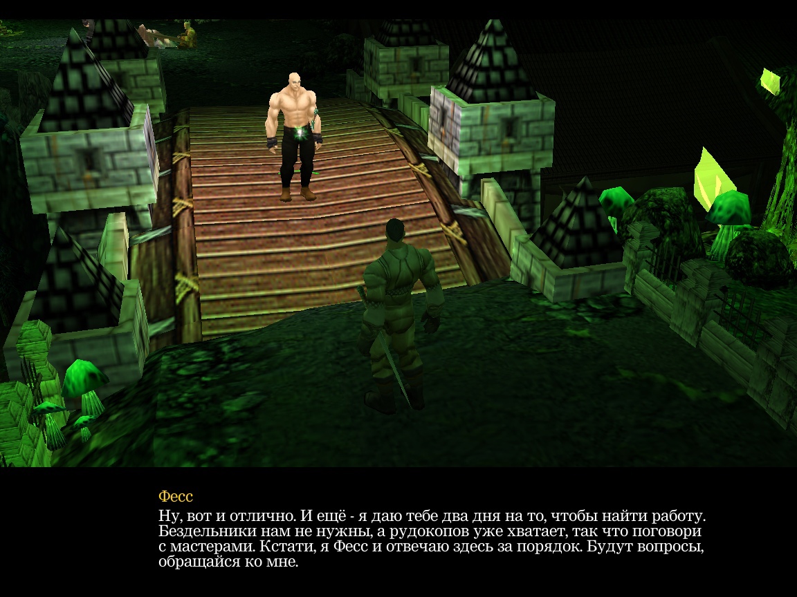 По началу нам встречается тюремщик Фесс, который сразу даёт нам указания, т.к. он тут всем рулит, а не староста поселения. "И вообще. раз человек в тюрьме, то его дом можешь забрать." Какие-то абсурдные сюжетные зарисовки в начале. Ну, и разумеется Фесс рекомендует нам найти работу, потому что в поселении бездельников не любят.