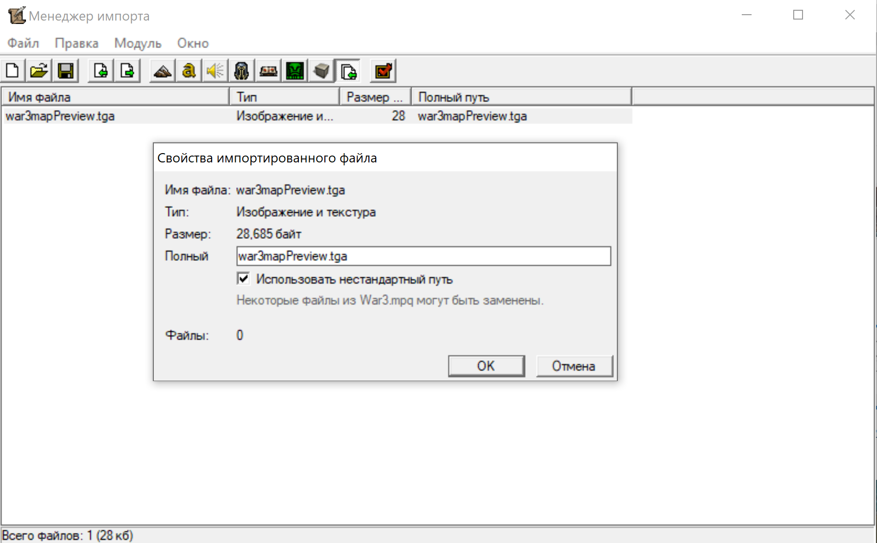 Чтобы добавить в карту своё превью, которое будет корректно отображаться в старых версиях клиента Warcraft III (до 1.31), достаточно импортировать в карту файл этой картинки с именем и форматом war3mapPreview.tga. Обязательно размер картинки должен быть 256x256 пикселей. Допустимая спецификация tga: Изображения с палитрой или TrueColor (24 или 32 бит на пиксель). Этот файл должен лежать в корневой директории импорта карты: