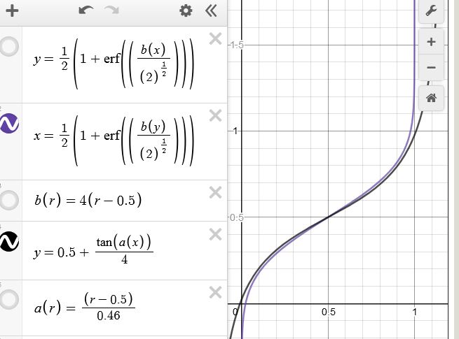 Для преобразования равномерного распределения в близкое к нормальному предлагается следующая формула: y = 0.5 + tan( (x-0.5)*2.17391 )*0.25