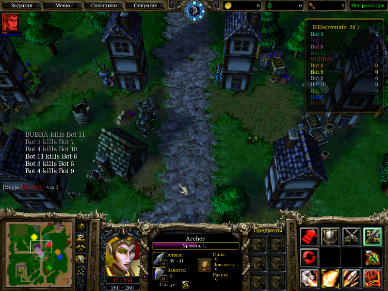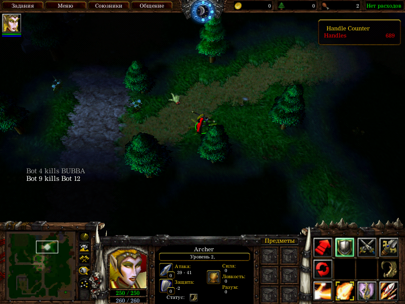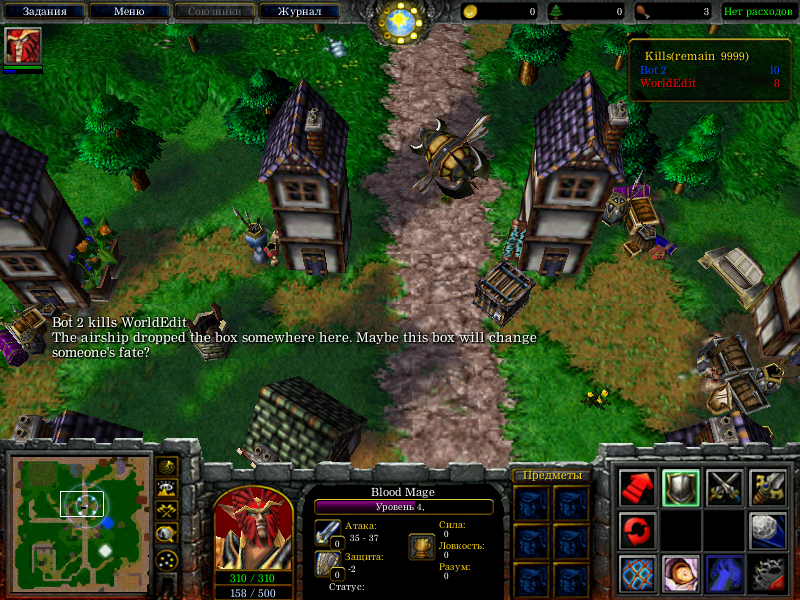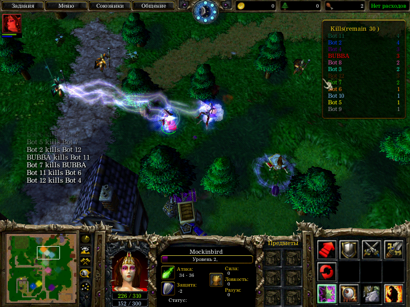 - Каждые 10 секунд на карте появляется либо одна случайная руна(здоровье, мана, скорость, рассеивание), либо книга на усиление базовых характеристик(здоровье, сила, ловкость, разум)