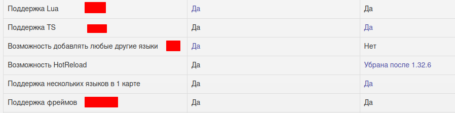 | Возможность HotReload | Да | Убрана после 1.32.6 |