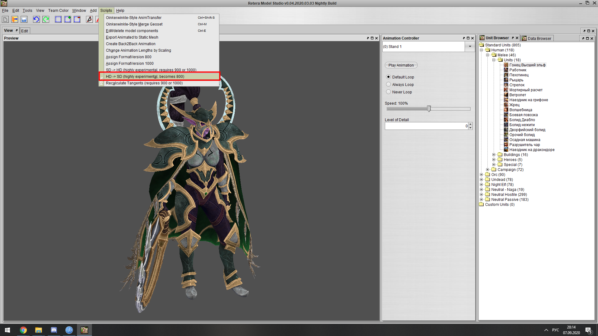 Scripts => HD -> SD, модель тут же потеряет текстуры, ничего страшного, сохраняем модель на рабочий стол в формате MDL (не MDX, а MDL) и ретеру можно закрывать на этом, она нам больше не потребуется.