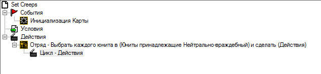 И присваеваем действие, называемое на корявых русских триггерах (просто привык к ним) как "Обычное значение юнита", а в джассе "SetUnitUserData". Это действие присваивает крипу строку, которую мы используем как число.