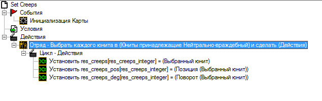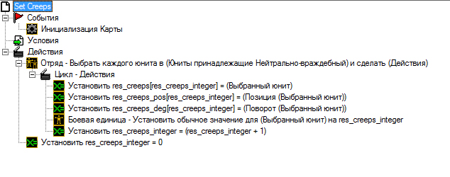 Первым триггером мы записываем каждого крипа в переменные, создадим их:
