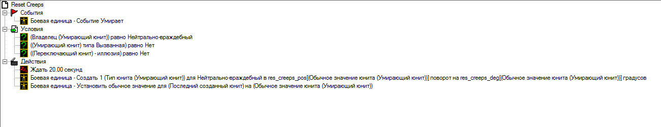 Итак, как не странно, все крипы записаны, осталось их воскресить после смерти. Обносим триггер условиями, чтобы не воскрешались все подряд: