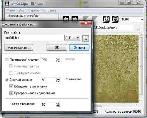 После проделанного выше открываем BLP Laboratory, где жмем Файл->Открыть и выбрав текстуры, названия которых мы видели в предыдущем шаге, конвертируем их в Blizzard Picture – *.blp. Качество и размер оной выбирать только Вам. Сохраняем.