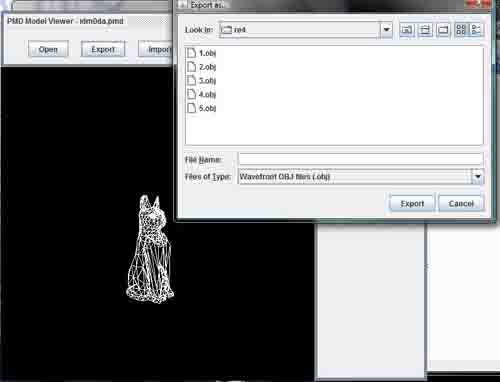 Когда откроется модель, будет видно только её скелет. Нажимаем кнопку Export, и в появившемся окне выбираем любую папку, и сохраняем модель с удобным для Вас именем. Советую создать отдельную папку, так как PMD Viewer вместе с нужным нам *.obj выгружает информацию обо всех объектах, использованных в модели в виде формата *.mtl (он нам не нужен – можете открыть блокнотом, и Вы поймете: ничего интересного), а также текстуры во всем известном нам формате *.tga (Targa), которых может быть очень много.