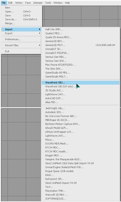 После того, как MilkShape 3D открылся, нажимаем File->Import->Wavefront OBJ....