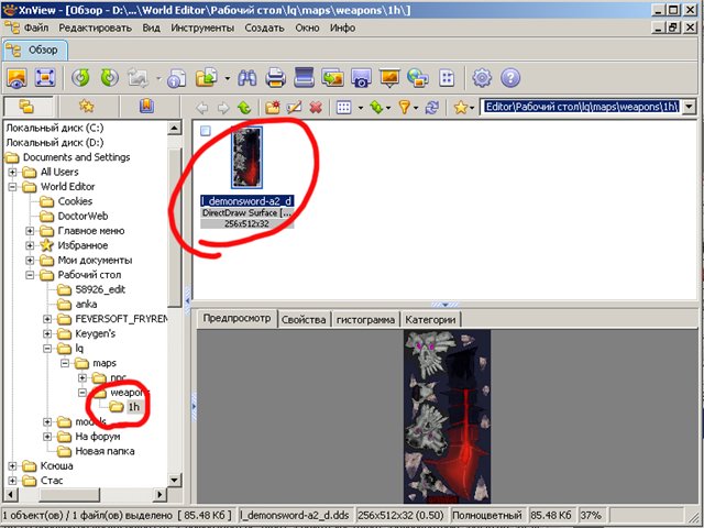 - Открываем XnView – будим проводить не сложные манипуляции с текстурами. В dds формате ( как уже говорилось ранее ) у нас находиться наша заветная текстура, которую мы будем натягивать на нашу модель. И так мы идем искать текстуру для нашего меча путь к ней такой: \Каталог_игры\pak\ graphics03.zip\lq\maps\weapons\1h\l_demonsword1h-a1_d.dds. Обращаю внимание на то что там есть еще похожие названием текстуры но на конце названия у них такие буквы “n и sg” эти текстуры нам не нужны.