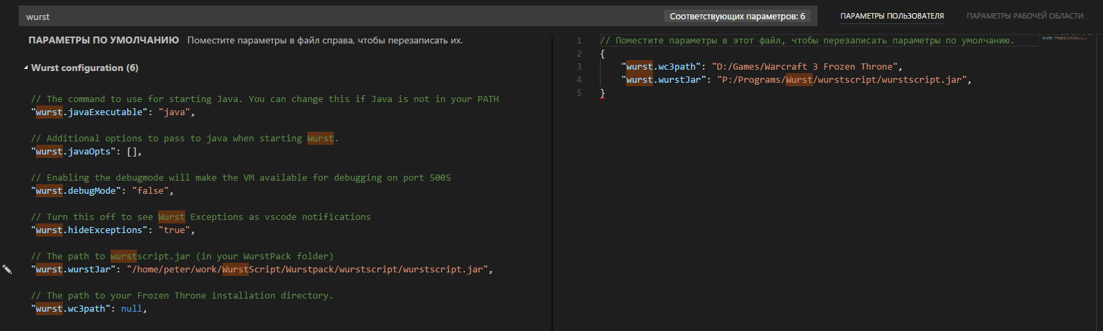 - Измените стандартное значение этого параметра "/home/peter/work/WurstScript/Wurstpack/wurstscript/wurstscript.jar" на путь к wurstscript.jar в директории скачанного WurstWE