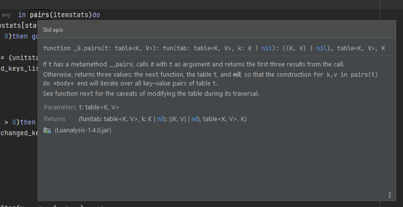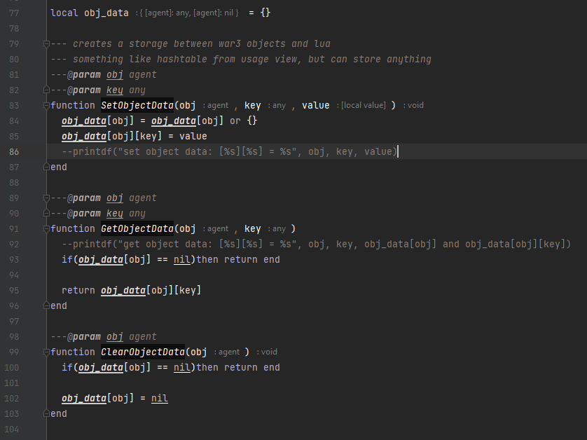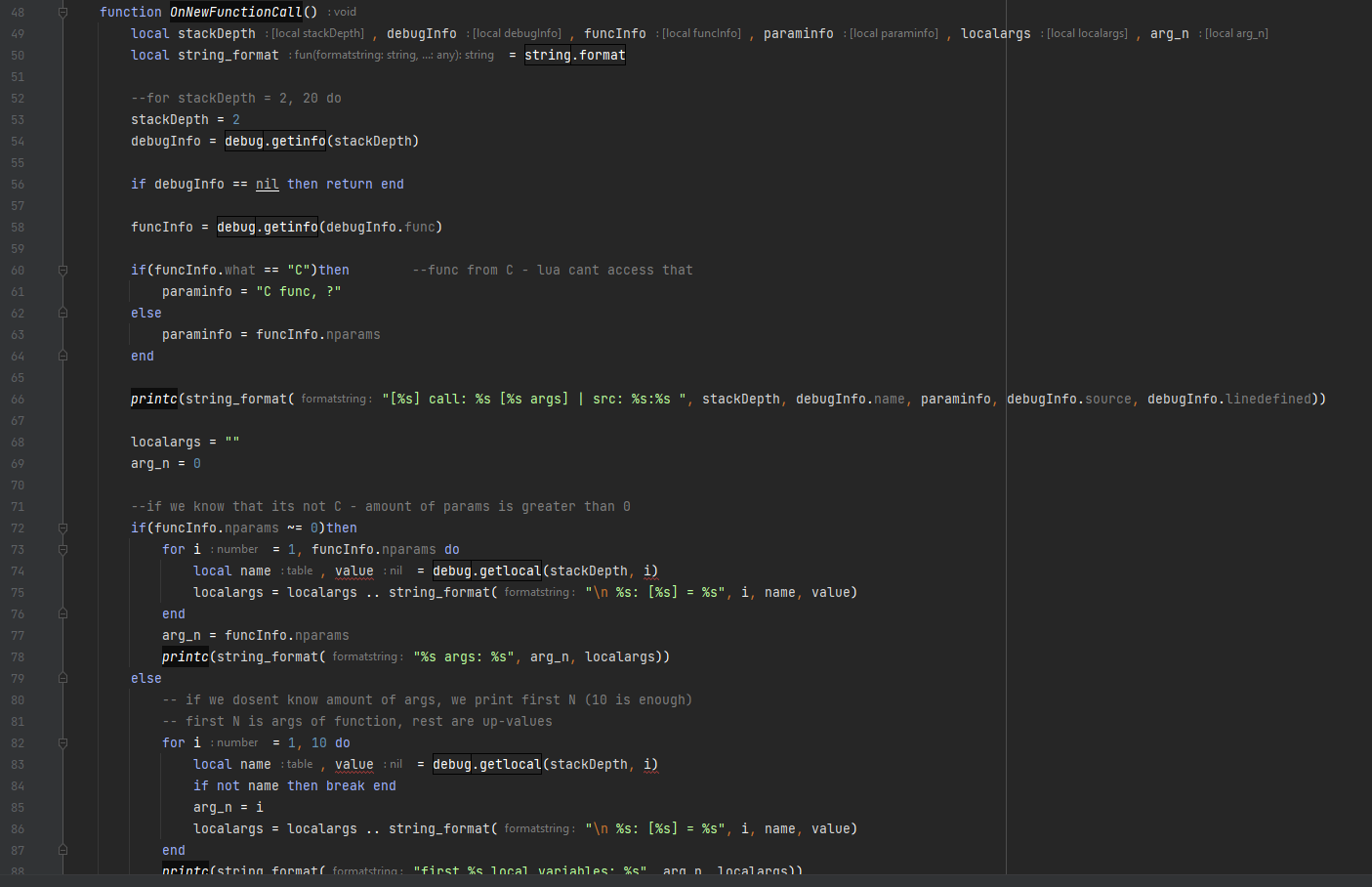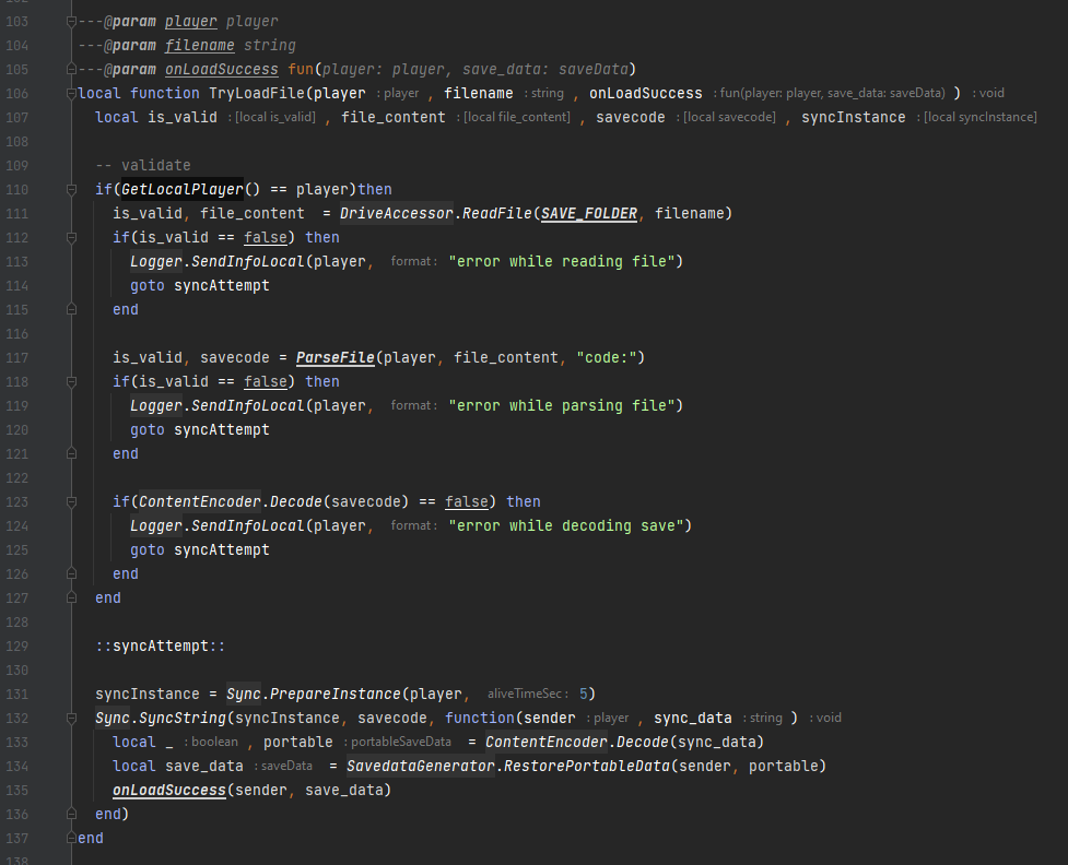 Реализован на Lua, типы проставлены через плагин LuaAnalysis. Код в основном в стиле фп, но разбитый на файлы; однако есть и некоторый функционал, оформленный в виде закрытых модулей, которым нужно довольно много доп кода для работы, пример - save-load-система, что читает и пишет в файла, и автоматически синхронизирует сейв код между игроками