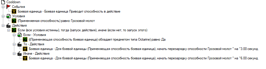 Функция SpellCD_Actions() добавляет триггеру действие, переменная cooldown ссылается на созданную нами таблицу выше и берет оттуда значение перезарядки для нужного нам уровня способности. А следующая функция проверяет выполняется ли функция наличия у юнита октарина (OctarineCondition), т.е. возвращает ли она true, и в этом случае уменьшает перезарядку на 50%. После чего уже перезарядка способности вызывается принудительно на cooldown секунд.