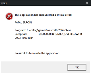При сбое из-за достижения лимита памяти стека, который может возникнуть из-за рекурсии в сценарии карты (например, при нанесении урона, во время обработки события получения урона), игры закрывается без каких либо окон и создания файлов с отчётом об ошибке.
