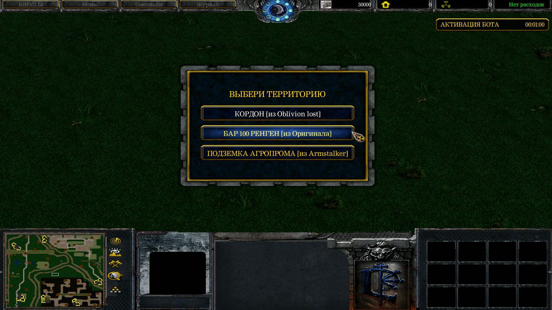 - Карта война группировок, основана на последней версии наработки S.T.A.L.K.E.R PLATFORM. Карта представляет возможность поиграть за любимую группировку, их в карте представлена 9 на выбор. Группировки в карте [Сталкеры], [Бандиты], [Свобода], [Долг], [Наемники], [Монолит], [Военные], [Чистое небо], [Ученые], у всех группировок есть слабые и сильные стороны. Игрок также учитывай что на пример -- Бандитам, будет очень сложно победить такую группировку, допустим как Военные. А также в карте представлено сражение на 3-х локациях, это кордон, бар 100 ренген, подземка агропрома. Все локации делал максимально точно, как в настоящей игре или модов на S.T.A.L.K.E.R. Кордон из билда, Бар 100 ренген оригинал, Подземка агропрома взята из Armstalker. Если кто играл или видел можете попытаться сравнить. Чтобы победить, надо захватывать как можно больше ресурсных точек, сколотить свою мощную банду, прокачать ее, вооружить крутыми стволами, и смять противника под ноль.