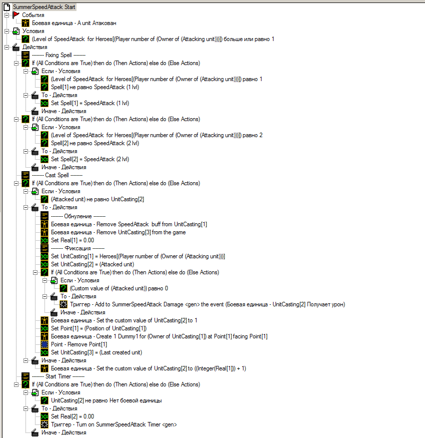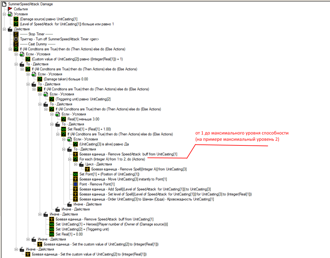 В условии ставим блок на нужного источника урона (damage source) и через проверку боевой единицы, которая получает урон, выключаем таймер (второй триггер). В первой развилке через условие проверяем что номер атакованного превышает только на 1 ед. заряд (в иначе выравниваем номер к номеру заряда), во второй развилке проверяем что урон больше 0 (анти-болк) дальнейшие развилки необязательны, кроме проверки заряда, который увеличивается до 3. После прибовляем заряд на 1 ед., удаляем статус (баф) ускорения герою, удаляем через цикл (от 1 до максимального уровня способности) зафиксированные способности у dummy и переносим dummy ближе к герою, даем ему зафиксированную способность, после уровень, выдаем приказ на damage source (заранее зафиксированный - атакующий). Но если цель, снимаем статус ускорения (баф) и переписываем боевые единицы, согласно массиву и скидываем число на первый заряд не обязательно, комментарии на видео .