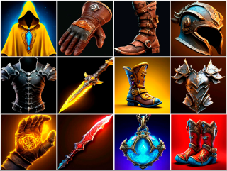 Пак разнообразного оружия разной тематики и направленности. Включает по 5 вариаций: щитов, мечей, кинжалов, топоров, луков, молотов и посохов.