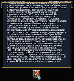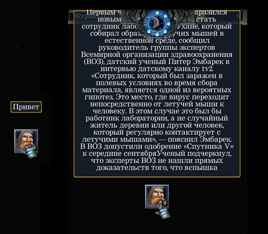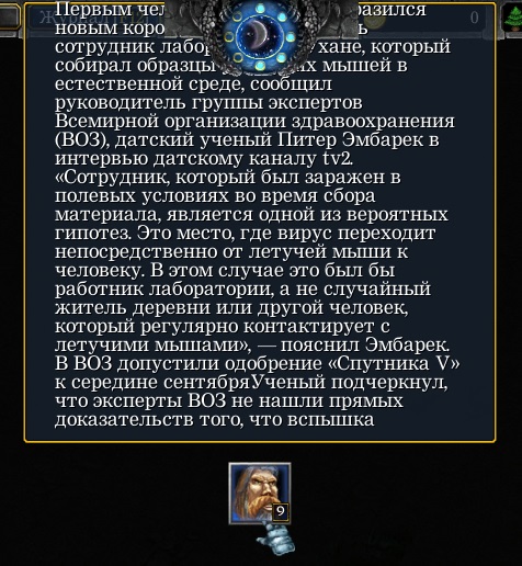 BlzFrameSetText(tooltipText, "Первым человеком, который заразился новым коронавирусом, мог стать сотрудник лаборатории в Ухане, который собирал образцы у летучих мышей в естественной среде, сообщил руководитель группы экспертов Всемирной организации здравоохранения (ВОЗ), датский ученый Питер Эмбарек в интервью датскому каналу tv2. «Сотрудник, который был заражен в полевых условиях во время сбора материала, является одной из вероятных гипотез. Это место, где вирус переходит непосредственно от летучей мыши к человеку. В этом случае это был бы работник лаборатории, а не случайный житель деревни или другой человек, который регулярно контактирует с летучими мышами», -- пояснил Эмбарек. В ВОЗ допустили одобрение «Спутника V» к середине сентябряУченый подчеркнул, что эксперты ВОЗ не нашли прямых доказательств того, что вспышка коронавируса связана с исследованиями летучих мышей в лаборатории Уханя. В марте этого года ВОЗ опубликовала доклад о возникновении COVID-19. ВОЗ представила в нем четыре версии появления вируса. Наиболее вероятной авторы считают версию о передаче коронавируса человеку от летучих мышей через животное-посредника. При этом версию об утечке вируса из лаборатории в Ухане в ВОЗ назвали «крайне маловероятной». Затем гендиректор ВОЗ доктор Тедрос Аданом Гебрейесус заявил, что организация готовится ко второму этапу расследования появления коронавируса и ожидает прозрачности от китайских властей. Он заявил, что исключать версию, что коронавирус распространился после утечки из лаборатории в Китае, пока рано, и призвал Китай к открытому сотрудничеству. Он также сообщил, что ВОЗ планирует проверить лабораторию в Ухане, рядом с которой были зарегистрированы первые случаи заражения COVID-19.")