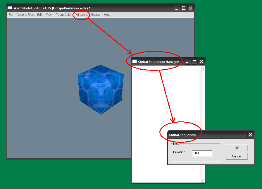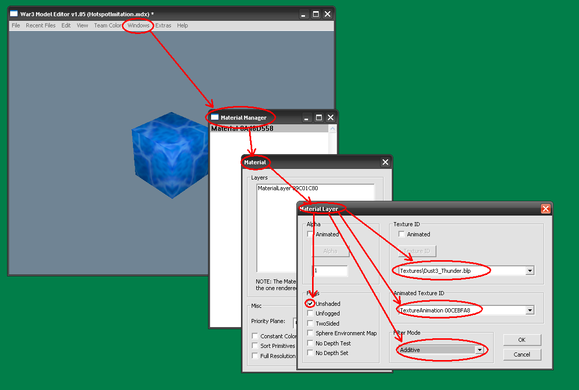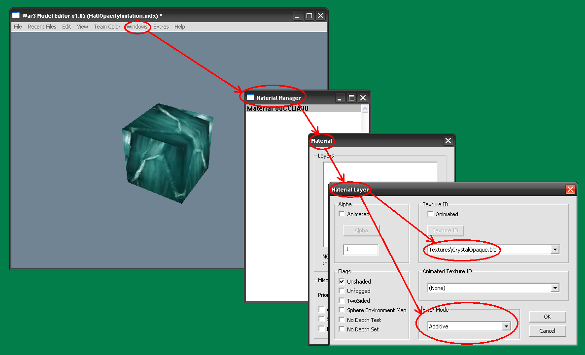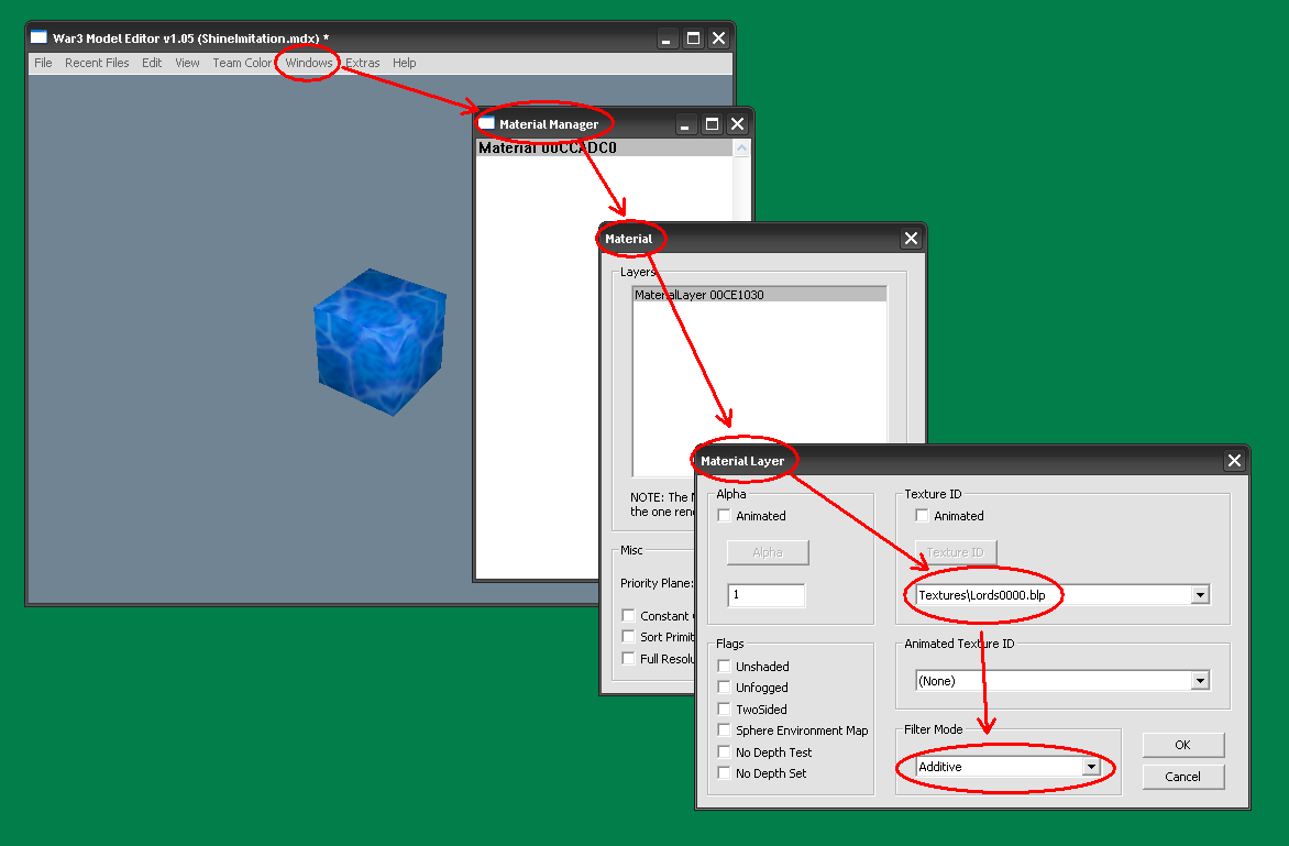- Открываем модель в War3ME. Создаем новый материал с той же текстурой что и у геосета, который мы редактировали, только “Filter mode” ставим на “Additive”.