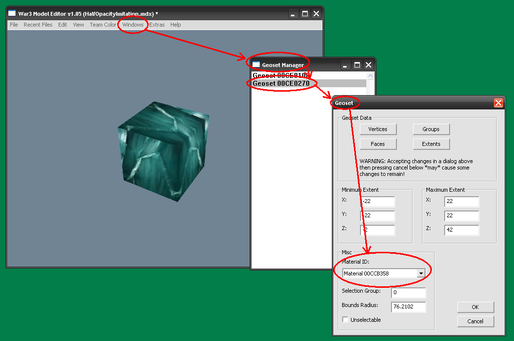 - Открываем модель в War3ME, находим нужный материал.