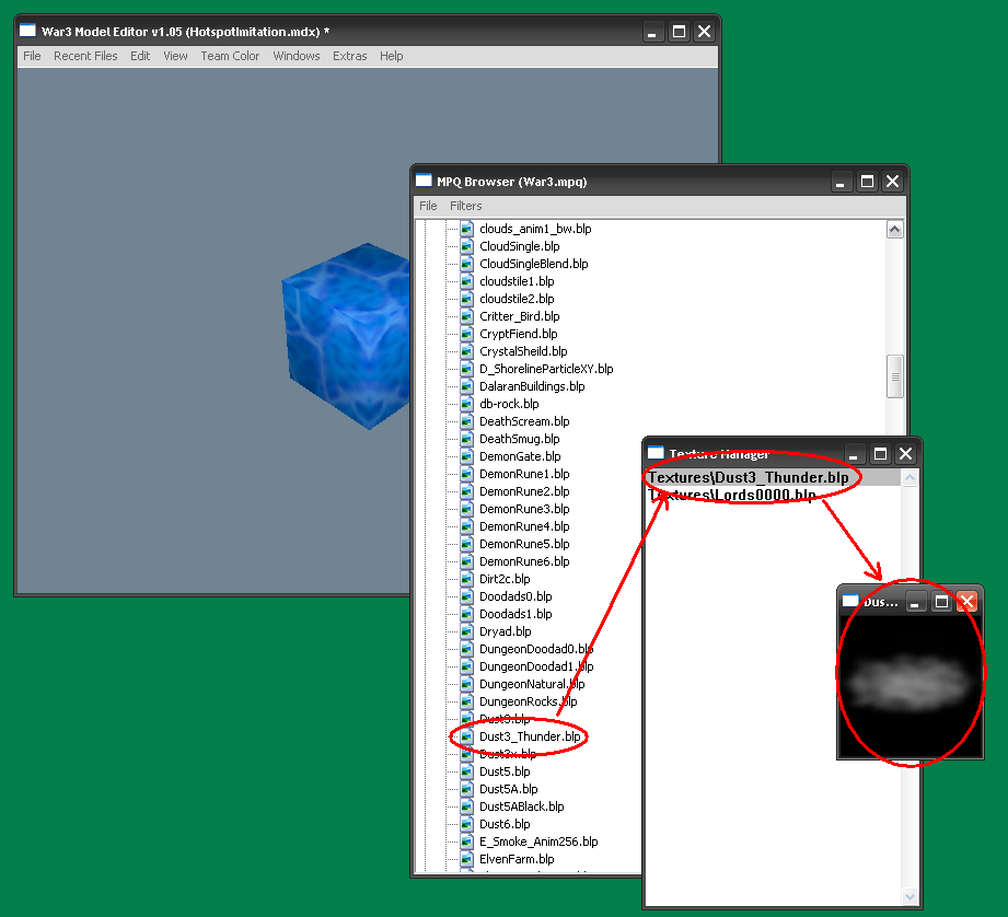 - Откроем её в War3ME и добавим из mpq-браузера текстуру “War3.mpq\Textures\Dust3_Thunder.blp”.