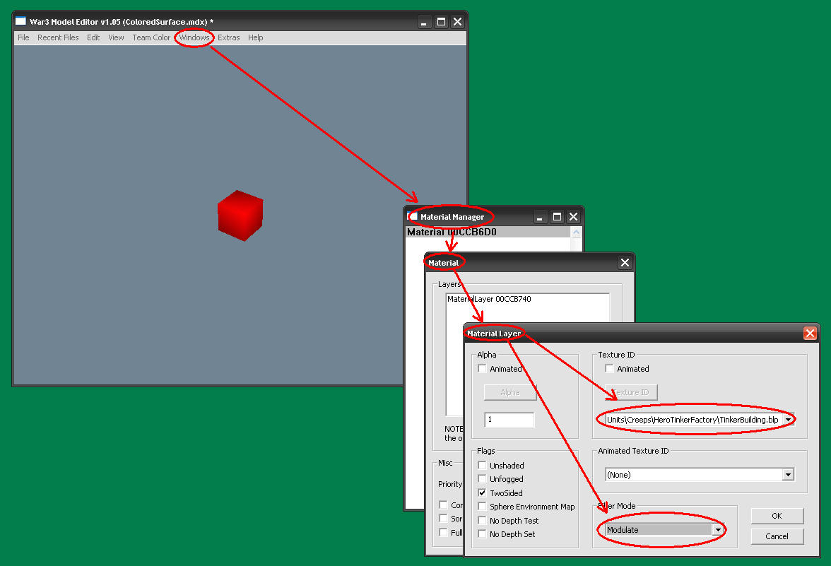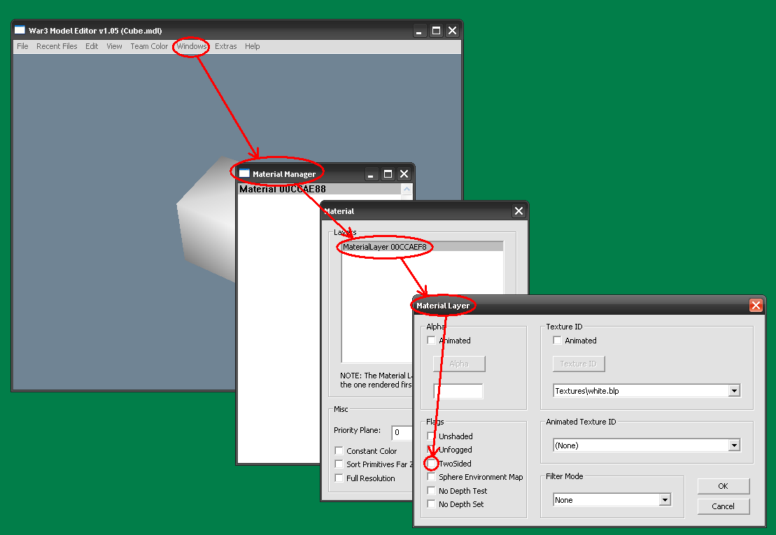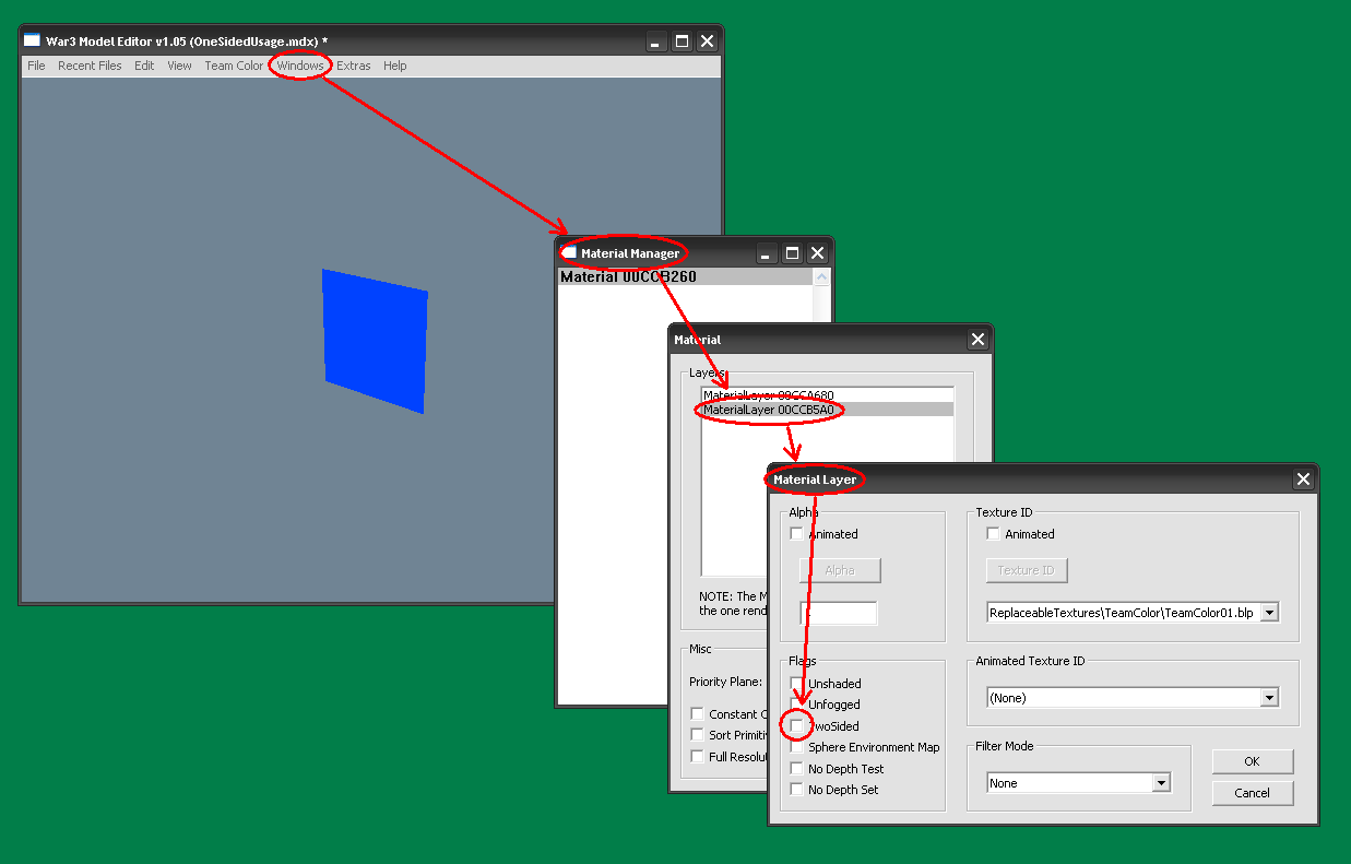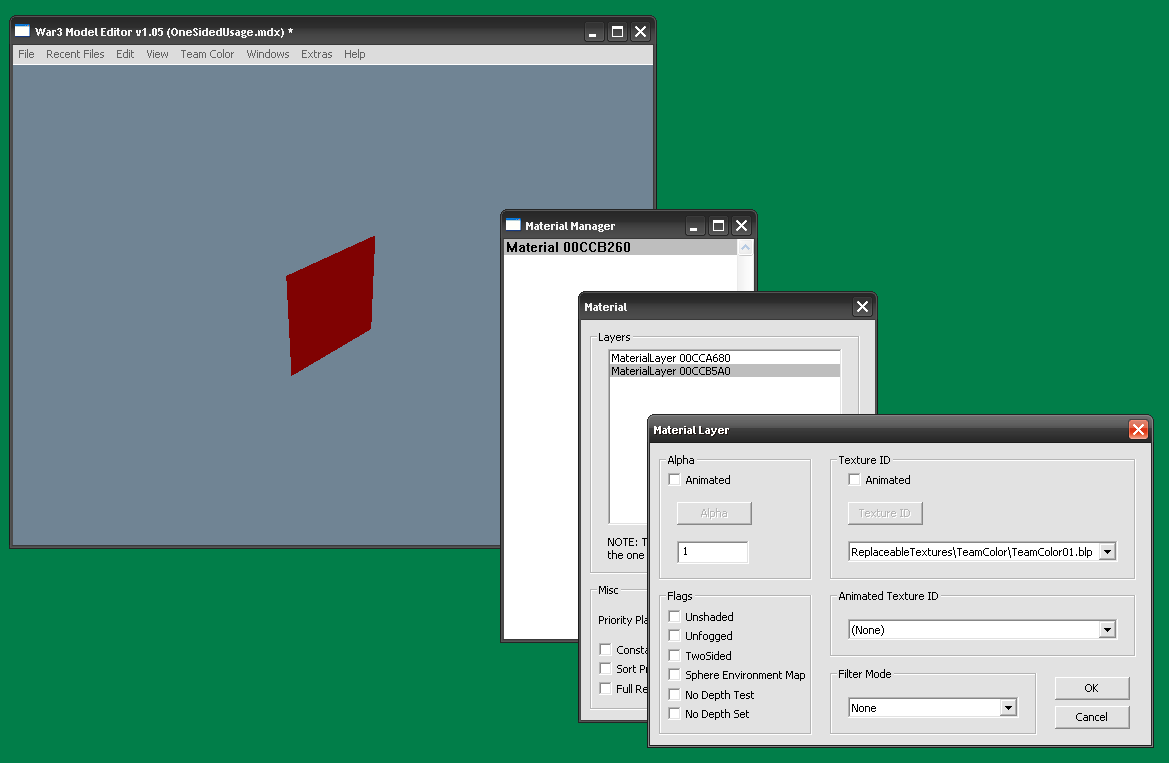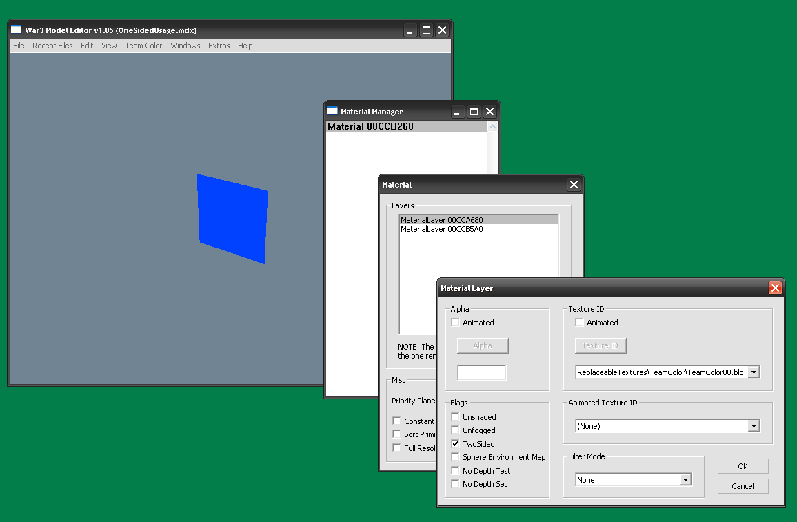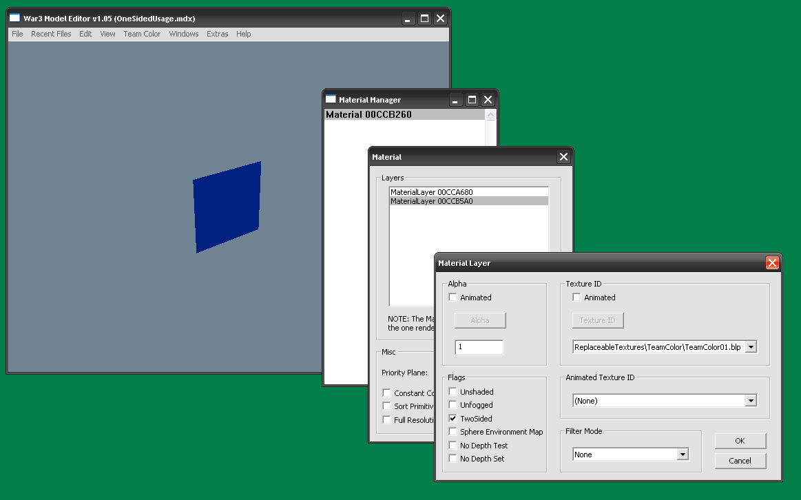 - Ещё перед тем, как начать строить геометрию в mdlvis'е, откройте модель в War3ME, и убедитесь, что галочка “Two sided” у материала будущего геосета не стоит.