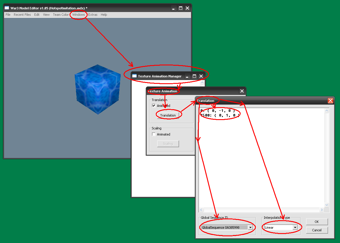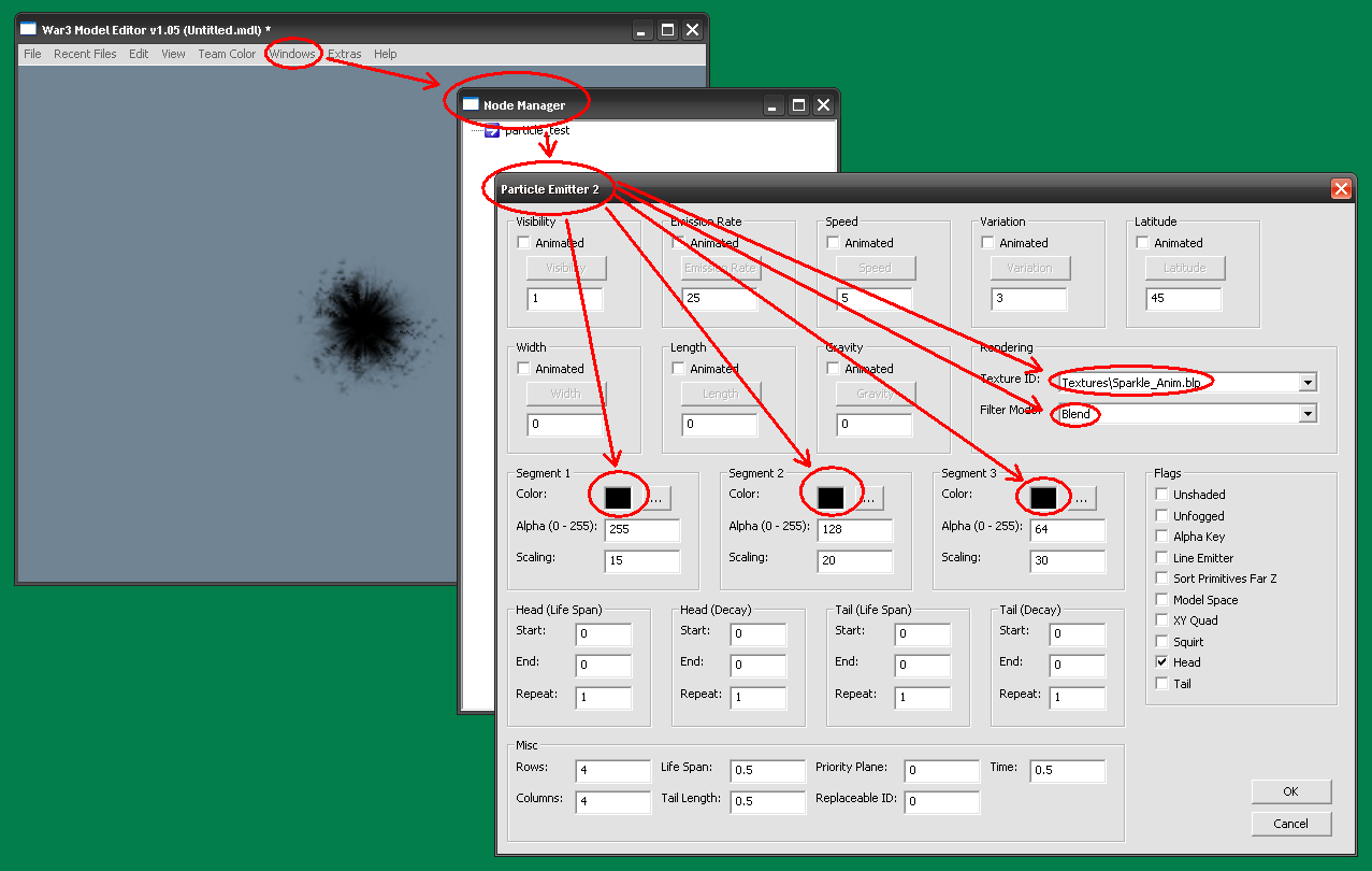 Примечание: советую посмотреть стандартную модель “War3.mpq\Abilities\Spells\Undead\FreezingBreath\FreezingBreathMissile.mdx”, в ней реализован такой прием.