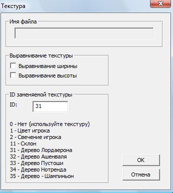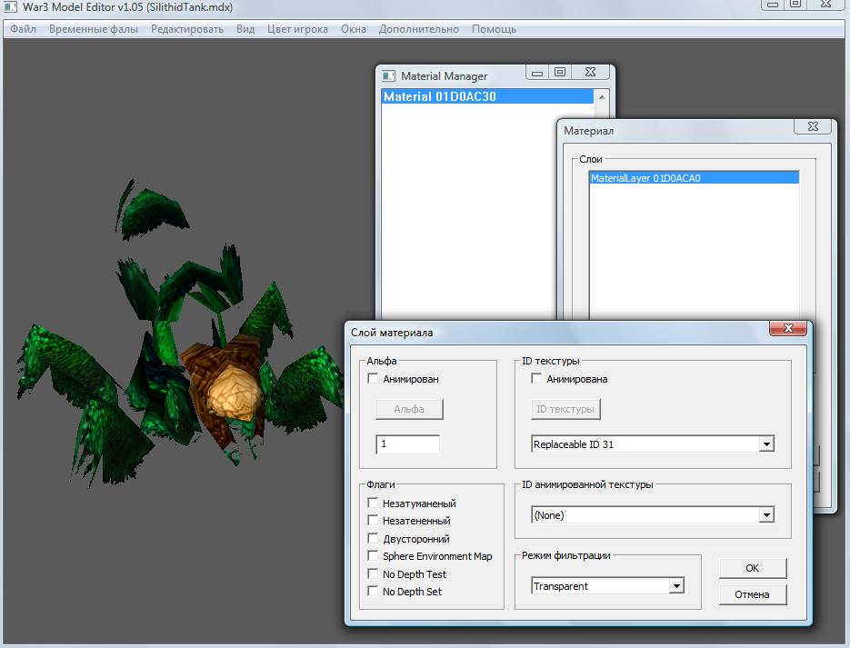 2. Открываем модель в War3 Model Editor, заходим в "Окна - Менеджер текстур" жмём в появившемся окошке правой кнопкой мыши и выбираем "Создать пустой". Затем на появившемся "Replaceable 0" кликаем правой кнопкой мыши и выбираем редактировать. В поле ID пишем число 31 и жмём ОК.