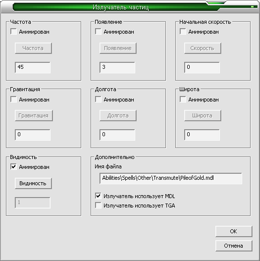 Итак, Particle Emitter 1 – это такой вид источников, который позволяет прикрепить к модели еще одну дополнительную (внешнюю) модель. Также, по словам Алексея и по допустимым параметрам в W3ME, можно использовать в качестве частиц текстуру, но у меня не вышло (да и зачем это надо, если есть Particle Emitter 2?).