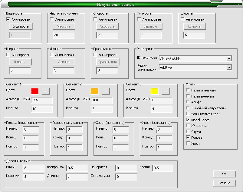 - 8.9) Голова/Хвост (появление/затухание). Появление и исчезание головы и хвоста (см. далее). Начало/конец – на каком расстоянии от центра; Повтор – кол-во повторов. Хотя как это работает и какая разница между разными значениями, непонятно…