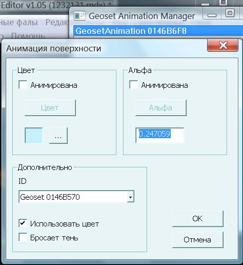 Можно, конечно, поступить, как и с первой проблемой: изменить все вручную через блокнот, но у меня есть на это идея получше. Рядом с полем для альфы есть кнопка для анимаций. Так и называется "Альфа". Вот ее мы и нажимаем (сначала галку "Анимирован"), ставим напротив "0: " цифру 1, затем ОК. Все, единичка сохранилась в списке ключей и теперь не сменится на другое значение.