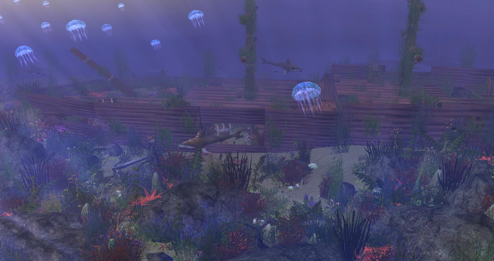 Все очень просто - нужно создать туман на карте (Сценарий-параметры карты - туман на местности). Поставьте галочку и выберите синий цвет или голубой. Значение нач. Z желательно сделать равным нулю (0.00). Кон. Z можно сделать любым, желательно в пределах от 2000 до 5000, в зависимости от видимости в вашей воде. Поэкспериментируйте, у вас получиться. Осталось лишь добавить подводной живности и получится что-то такое:
