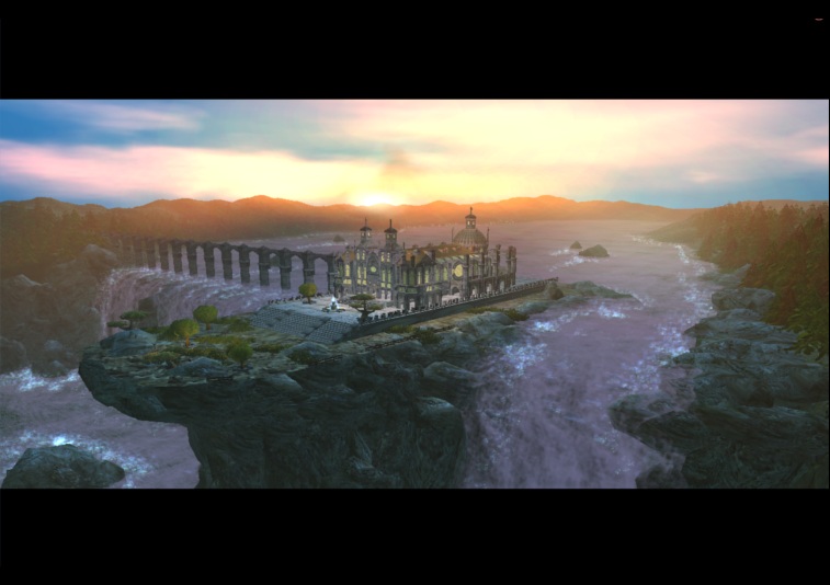 Недавно я сделал такой ландшафт. Вместо воды - альфа-тайл. Небо установлено туманное. Сделано отражение деревьев и травы в воде путем переворачивания декорации. Добавлю про облака - это все модель UberCloud (скачать). Скачайте ее, посмотрите, вы поймете, что она из себя представляет. Ее не нужно отражать в воде. Единственное хочу сказать - такая вода почти что не играбельная (только в редких случаях, ниже представлен пример). В основном такая вода подойдет только для роликов.