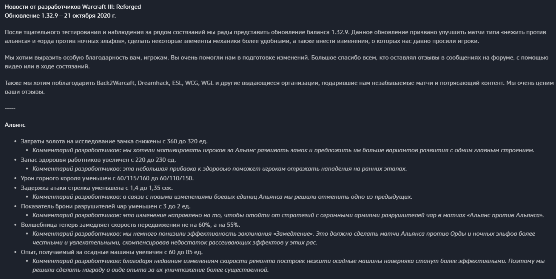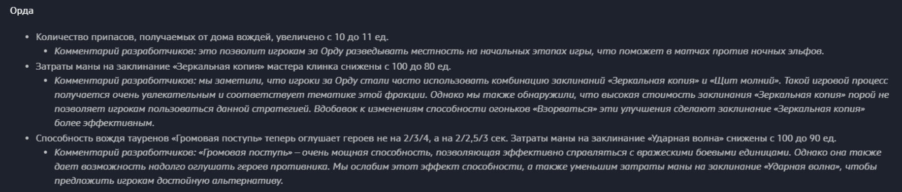 Комментарий разработчиков: в предыдущих обновлениях затраты золота на подготовку друидов-воронов были увеличены с целью подкорректировать баланс в играх ночных эльфов против орков. С тех пор условия мета-игры значительно изменились, и мы снова снижаем затраты, чтобы поощрить использование этой боевой единицы.