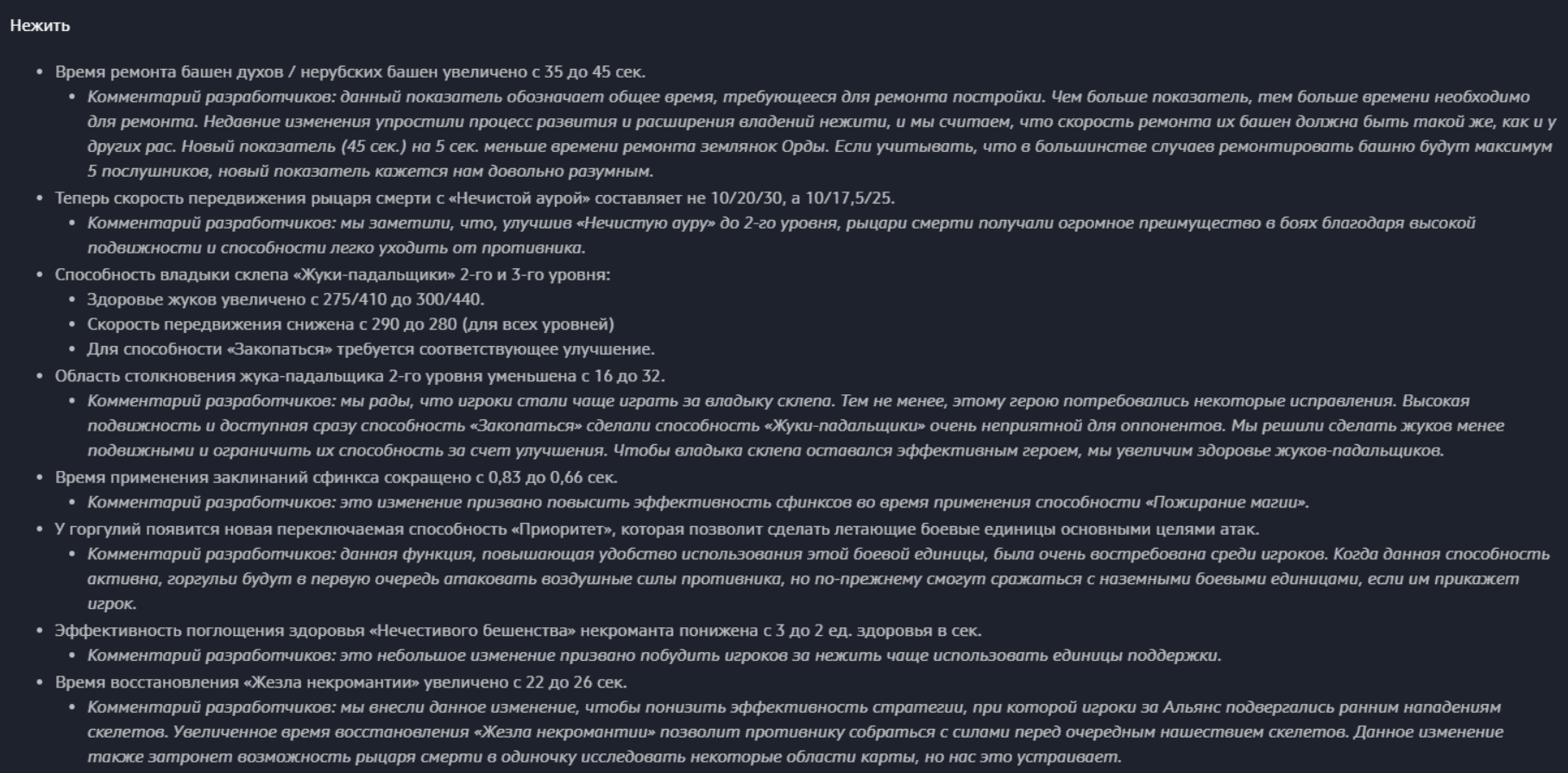 Комментарий разработчиков: в этом обновлении мы обойдемся без значительных изменений баланса, но хотим внести одну корректировку. Нам нравится, что игроки за нежить нашли новую стратегию для раннего этапа игры, сосредоточенную на макроконтроле при помощи владыки склепа, но нам хотелось бы обратить внимание на эффективность перехода с этой стратегией к среднему этапу игры. В частности, речь идет об эффективности диверсий против рабочих оппонента с помощью жуков 2-го уровня. В то же время мы хотели бы сохранить уникальные свойства жуков — неограниченное время призыва и способность закапываться. Поэтому мы решили уменьшить их живучесть. В условиях уменьшенного запаса здоровья жуков игрокам придется более тщательно управлять ими, и они смогут нанести меньше урона, прежде чем им придется закопаться.