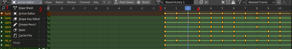 Переходим в окно Dope Sheet => Action Editor => Выбираем Экшен анимации, которые не имеет приписки от геосета, и назначем ей Fake User для каждой анимации