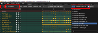 Переходим в окно Dope Sheet => Action Editor => Выбираем Экшен анимации, которые не имеет приписки от геосета, и назначем ей Fake User для каждой анимации
