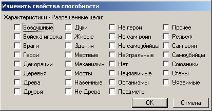 Характеристики - Разрешённые цели (способности) - разреш. цели данного спела