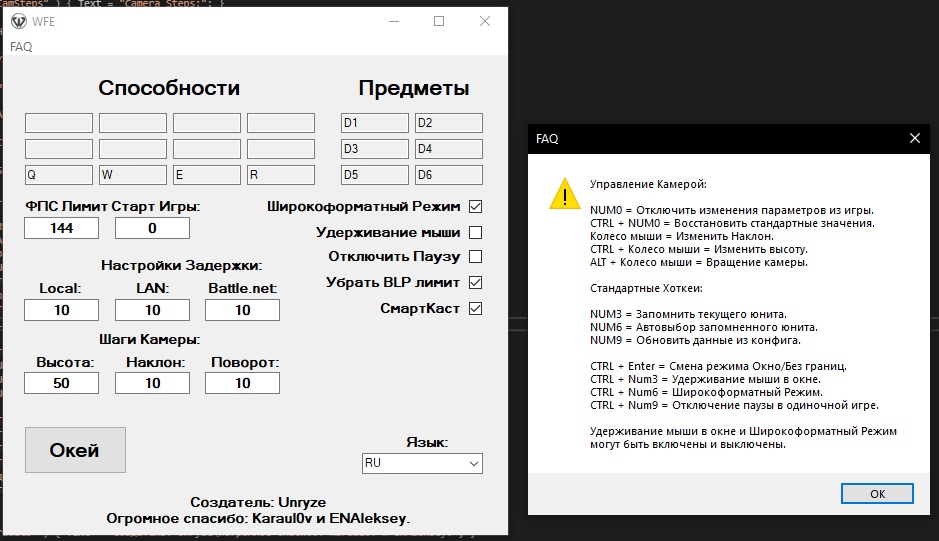 - Если WFEConfig.ini присутствует или же была нажата кнопка Окей для создания WFEConfig.ini, тогда все выбранные опции будут записаны в него.