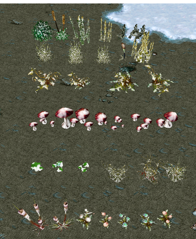 Три текстуры, которые после импорта превратят обычные растения в зимние, заснеженные. В архиве также присутствует карта с уже импортированными текстурами.